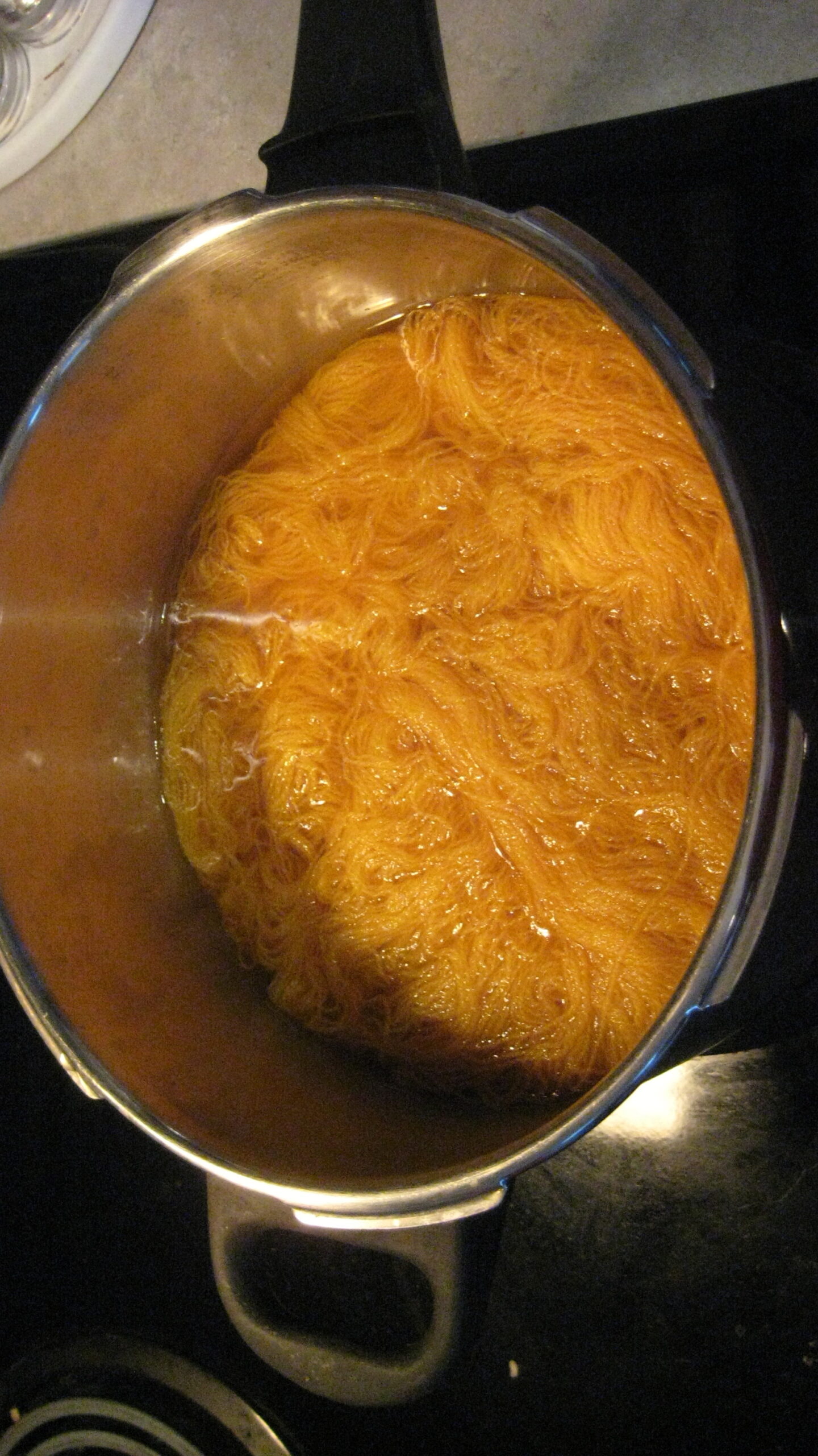 The yarn simmering … it’s not as bright as it looks here ….