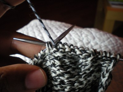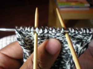 There are several heel turns out there, but for now I am going to keep this basic. What we will do is an adaption of short rows – we will go partially across a row and turn back, creating a gap. Instead of using wraps to close the gap however (as you would with short rows), we will decrease across the gap in the next row. By repeating this process across the entire flap, we will create a bridge across the width of the flap as we gradually increase the number of stitches in the heel turn. Once this is done and you heel turned, we will be able to pick up stitches around the entire foot and start knitting in the round again.