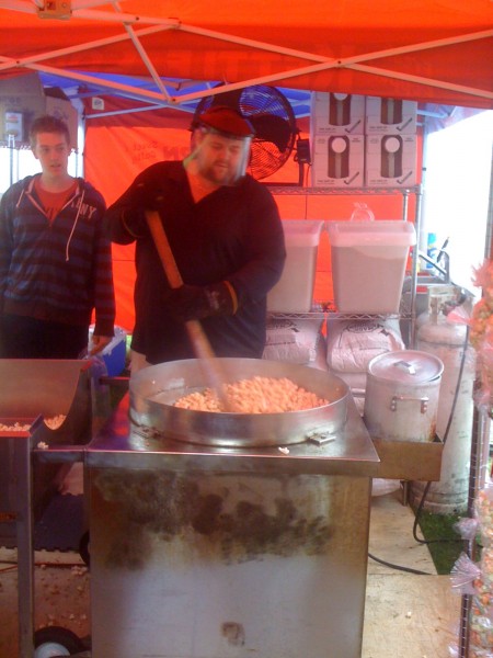 As for myself, unfortunately moving means it will be a couple of days before I can pick up some needles again. I’m in the process of helping Kate reorganize the house and both our stashes. I think between the two of us we have enough books and magazines for a library and definitely enough yarn for a store. But as Kate said, there’s no option of opening a store as you can’t sell your yarn, right? So aside from reorganizing and settling in, I spent the day enjoying Canada Day. There was a celebration in Steveston all day and it all stated with a great pancake breakfast. At this celebration there a cool kiosk selling kettle corn. What was really neat was watching the guy make the popcorn in a very large kettle. It was interesting to watch the process. He had on full body protection as well as headgear (see picture below) as apparently the oil (canola) splashes quite vigorously sometimes. The entire process only took four minutes!