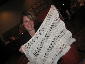 The second thing to check in about is the Lace KAL. How is everybody doing with that? I haven’t forgotten you. I would love to get some comments to let me know if you’ve started one, which one, and how it’s coming along. Pictures would be great! You can leave comments here on the site and send pictures to me via email at mrhugzzz@gmail.com. Antoinette, I know for a fact that you’re making one. There’s 2 more weeks in the KAL and I have 2 shawls left to do. Yup, I’m doing all three. Here is a picture of the first one, unblocked and undyed. I’m going to dye it when I block it (two birds with one stone) and do a post on the process as well. Any suggestions on what color or colors?
