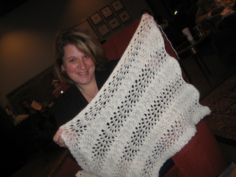 That’s Andrea holding it, well part of it. The other 5 feet of it are in her lap. Even though it is a very simple pattern and suitable for a first lace project for anybody, I was very impressed at how nice it is. If you chose this one I am sure you will be equally pleased. Onto the next one for me though …