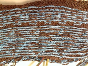 *Of Note – Because you are carrying another color along with your main color, the fabric you create will be thicker than one with just the single color – even if you’re only using the other color every 6 or 8 stitches (or more). As a result, it is imperative to do a gauge swatch when you are starting your work to make sure your garment will be the right size. You will also want to make sure that you are happy with the “feel” of the fabric that is being created.