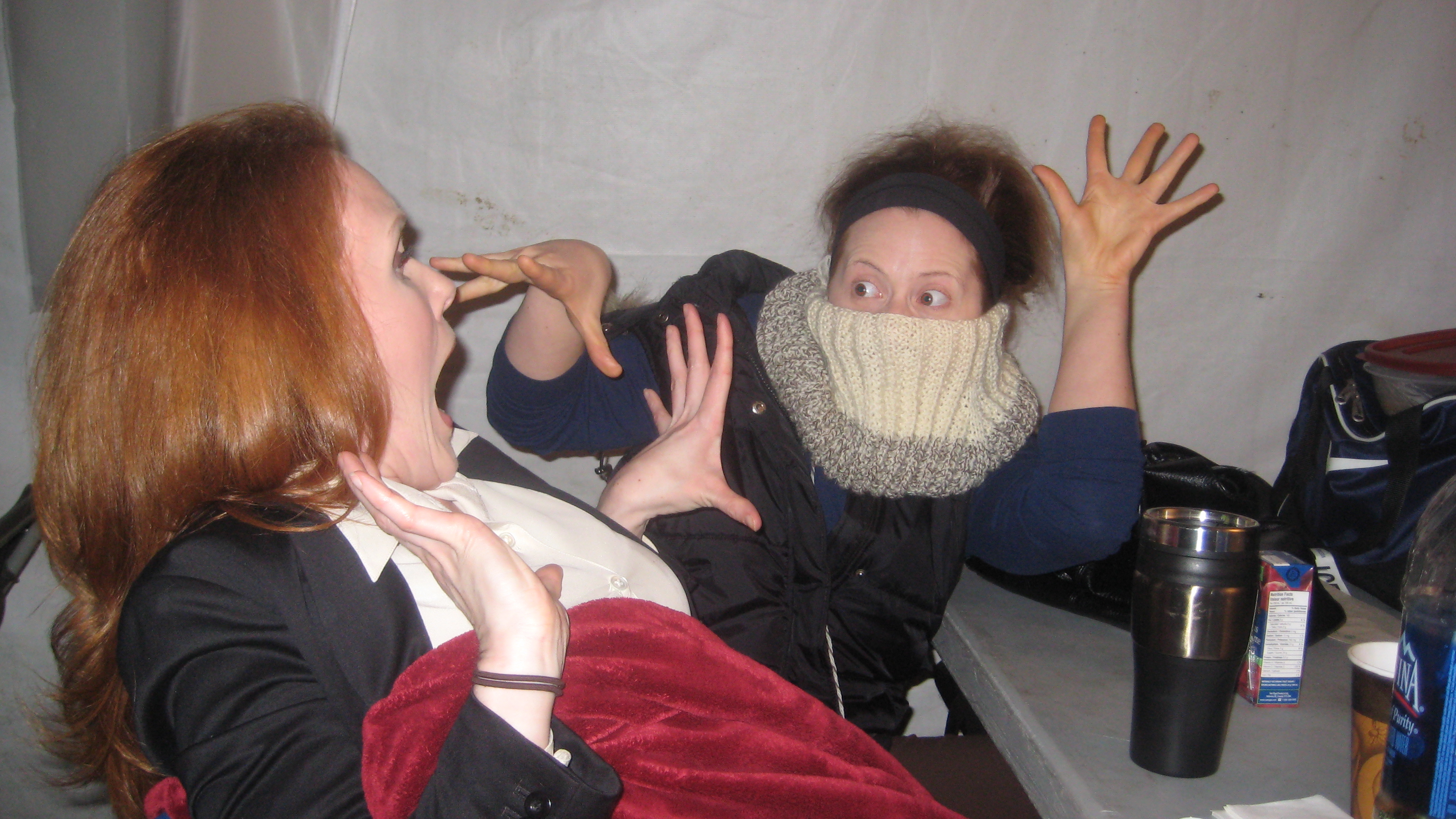 The really cool thing about working from the top down though is that it’s really fun. You see your work grow in a different way that’s exciting to watch. You can also try it on as you go and make goofy faces as Rebecca is doing in this picture. scaring her sister Jenn. As you can see we have too much fun at work! Now of course there’s a reason I’m talking about knitting a sweater from the top down – it’s because I’m doing one . Remember the sweater I made for Mike called Adam’s Rib? Well, I liked it so much that I’m doing one for myself in three colors. I thought I would do it top down though and show you the progress as I go along. I decided to start the neck with 4 double-pointed needles instead of a circular just for fun. After a few rows I switch to circulars and continue the work. Its a great way to make a raglan-styled sweater. You cold easily make it into a cardigan either by going back and forth or by doing it in the round and leaving room for steeks – a lesson for another day. I’m also using the Fibonacci sequence in a different way. I’m knitting the first 5 inches in one color, the next 8, in another, and then 13 in the final color. I’ll do the entire sweater in the round and post an update when it’s done.