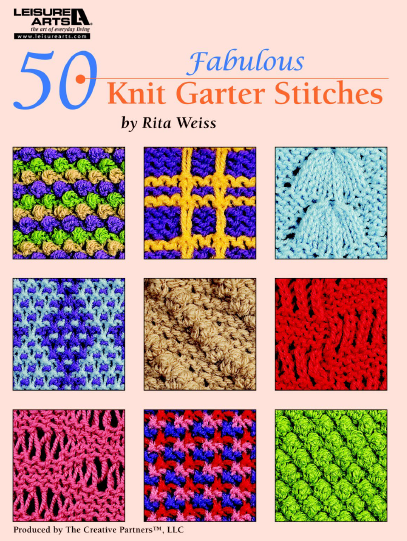 This is in no way the extent of the possibilities with the garter stitch. You can do a multitude of things with it. There is a book by Rita Weiss called 50 Fabulous Knit Garter Stitches that has 50 different pattern stitches you can make with garter stitches. The 50 pattern stitches are Diamonds, Shells, Feather Lace, Criss Cross, Stamen Stitch, Horizontal Bars, Hyacinth Blossom, Lacy Bobbles, Wave Stitch, Clusters, Tri-Color, Haystack, Chevrons, Leafy Lace, Berries, Brioche, Slip and Slide, Lozenges, Lattice, Bluebells, Checkers, Checks and Balances, Climbing Ropes, Traveling Brioche, Plaid, Arrowheads, Open Ribs, Slanting Bobbles, Two-Color Stripe, Diagonal Openwork, Honeycomb, Dotted Lines, Tiny Bobbles, Mesh, Textured Ridges, Cardigan Stitch, Lace Ripple, Eyelets, Zigzag Lace, Polka Dots, Crested Waves, Traveling Eyelet, Openwork, Intermesh, Springtime Lace, Fisherman’s Rib, Vertical Visions, Drop Stitch, Eyelet Columns, and Garter Cockle Shells. While some of these are not for beginners, you are sure to find something in thee that you may not have seen before and/or tickles your fancy. You can look for the book in your library or purchase it from Amazon – click the picture for the link.