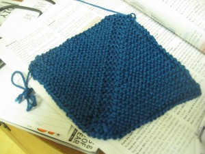 You will also notice that I am using circular needles. For portable projects, this is my preference. There are also some very neat advantages to using circular needles. One of them is that when using the two needles for the cast on I can simply pull on the nylon to remover the “second” needle. So now you’ve cast on the first bra cup and need only follow the instructions in order to complete it. The instructions are pretty straight forward and it uses a combination of increasing and decreasing to shape the cups. You need to make two cups. They will look like the one in the picture below.