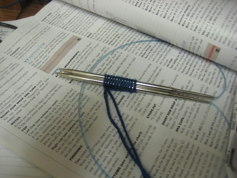Okay, now we’re set to get going. Now I’m not certain about the exact process you use when knitting something from a pattern, so I will go through this one with you in the manner that I do it. I know you’re not going to believe this (yes Anne, this is true), but the first thing I do is read through the pattern. It’s an important step not just to familiarize yourself with the pattern, but to make sure there aren’t any surprises along the way. In this pattern, when you first read through it, there are a couple of things that show up. The first thing is the construction of the garment. You will be making two bra cups first. After that, you then make the front of the top, then the back. The back is where there is a bit of difficulty, but we’ll be able to get through it. After that, it’s just a matter of finishing. During the finishing you will need to sew a lining into the bra cups. They suggest an old t-shirt or piece of cotton lining. I would recommend a good quality piece of cotton that best matches the color of your yarn. If you have a sewing machine, great, but if not you will be able to do this by hand as it is small enough. So this knit-a-long will give you a bit of a lesson in finishing if you haven’t done it before.