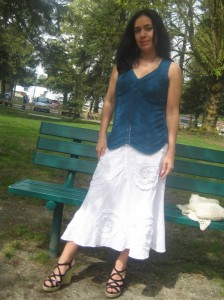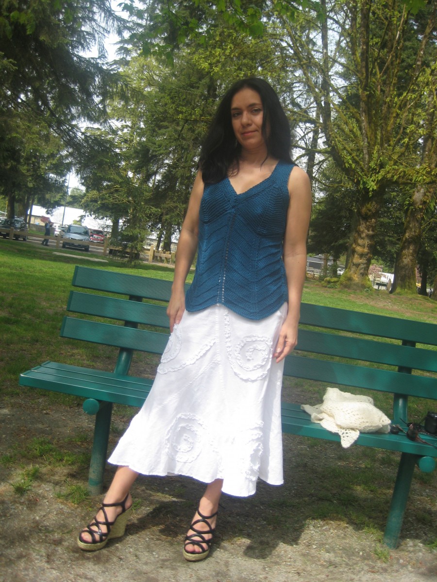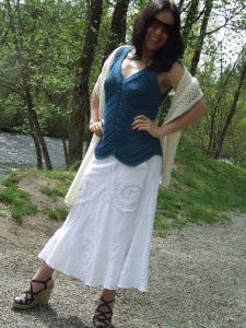 Overall, I was very pleased with the top and the way it came out. Of course, I have a few comments that may be of aid to you if you haven’t yet finished this top or choose to make it for yourself or someone else in the future. I substituted the yarn that was used in the original design and was very pleased with the choice I made – Patons Silk Bamboo. The resulting fabric was of medium weight but very soft to the touch (very important since this is worn on bare skin) and the drape is perfect for this piece. The cost difference was substantial, so if you are limited by a budget, this would be a great choice. Also, since the finished piece didn’t have the beads of the original design, it goes from casual to dressy quite easily and well. As you can see from the two pictures, it looks great with jeans for a summer picnic or barbecue or a skirt and shawl for a special evening out.