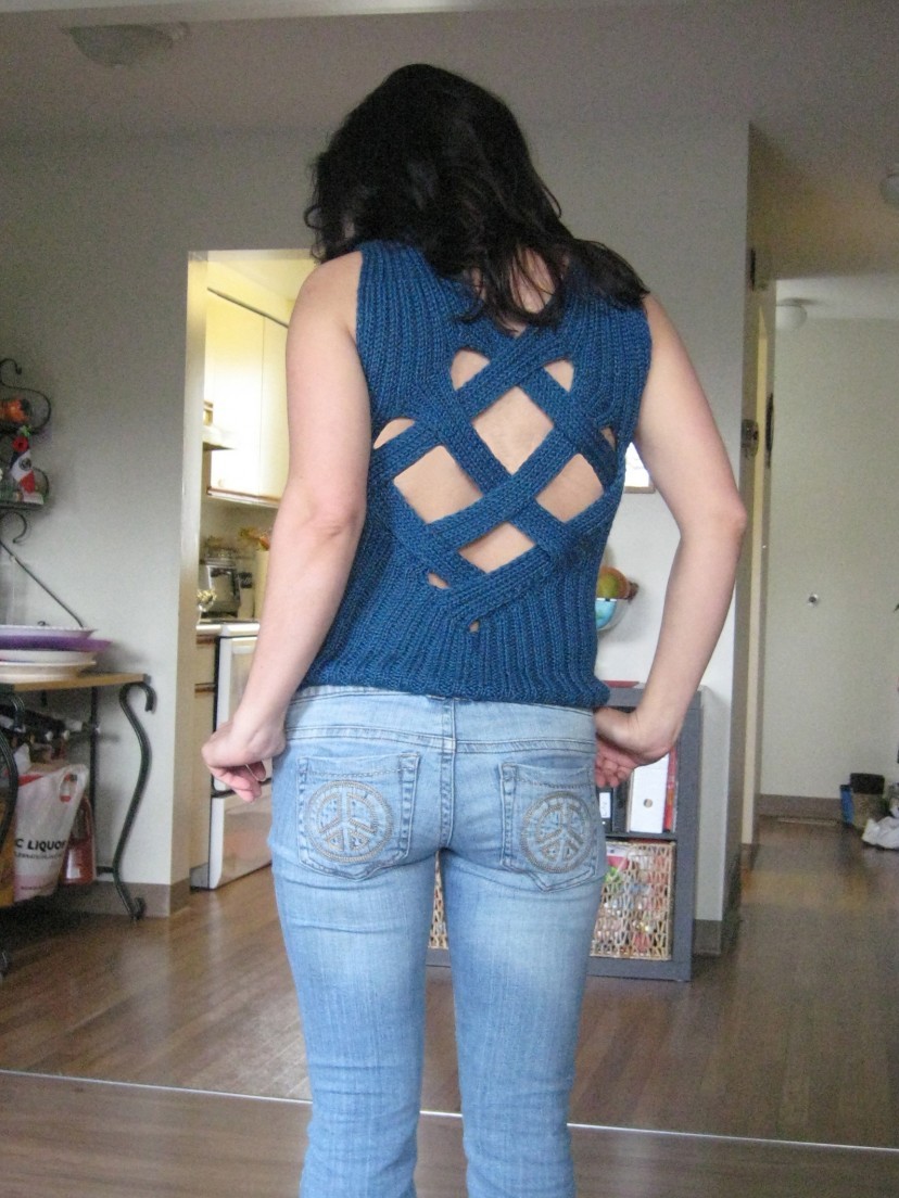 The second critique is really nitpicky, but it’s the sort of thing that got me into knitting in the first place. The small of a woman’s lower back has always been a very erotic and mysterious place for anyone who admires a woman’s form (okay, maybe it’s me). There have actually been studies showing that it is very similar to breast cleavage, and most people can’t tell the difference when shown pictures of the two. So, were I to make this again, I would have shorter straps (depending on who it was for), and I would accentuate the first overlap of the straps at the bottom of the piece on the back, to highlight the small of the back. Hey, I said it was nitpicking, and hindsight is 20 – 20, but I can’t help it, I’m a guy, and I love that spot!