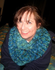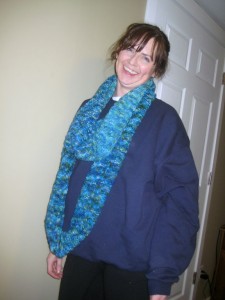 In order to accommodate the length of the scarf, as this one is almost 9′ long with the three balls, I decided to make it a circle scarf and seam the ends together. Luckily for me, with the colorway and the yarn, it’s not noticeable at all. Sure, if you inspect it carefully you’ll see it, but when it’s around the wearer’s neck, you can’t. If I were doing it over and doing it the same way, I would have used a provisional cast on and then grafted the ends together to eliminate the seam altogether. In the end, Lisa (she’s who got it), was ecstatic about the finished product, and I was too. Here are a few pics to show you what it looks like. I’ll try and get her to let me take some more and do up a pattern!