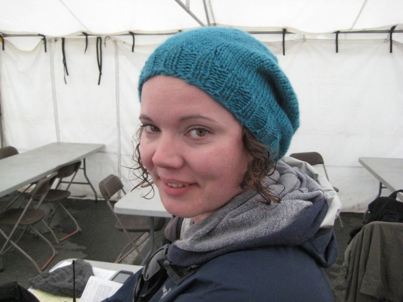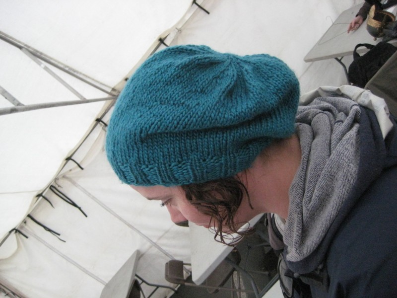 The recommended needle size for Latte is 5.5mm and there’s 75m per ball. I had two, so I decided to knit a slouchie hat with it. I will have the pattern available shortly, and if you’re local to Vancouver, you’ll be able to go to W.I.N.E. and get it when you get the yarn. 2 balls was indeed enough, and I had about 10m left over, so I could have made it a little longer. I also had a slightly ribbed cuff on the hat, as I like the slouchies better that way. I know most like to have it extremely loose at the bottom, but I prefer it like a tam or beret, to hold the hat on the head. Here is a picture of my friend Crystal wearing it …