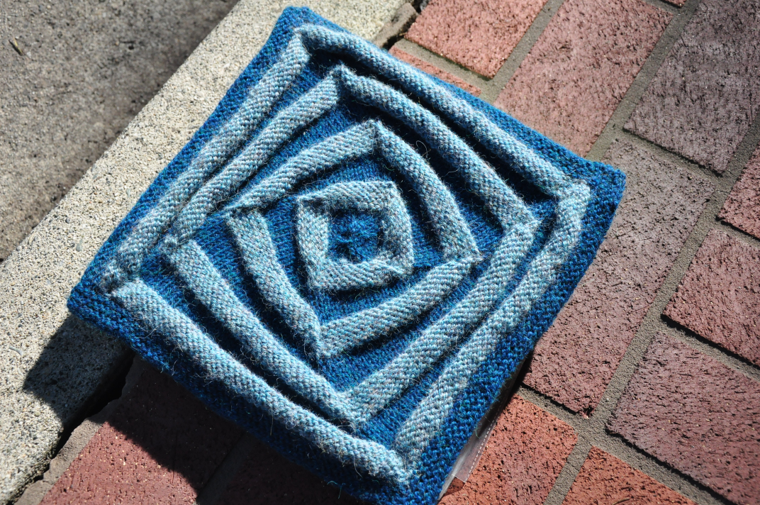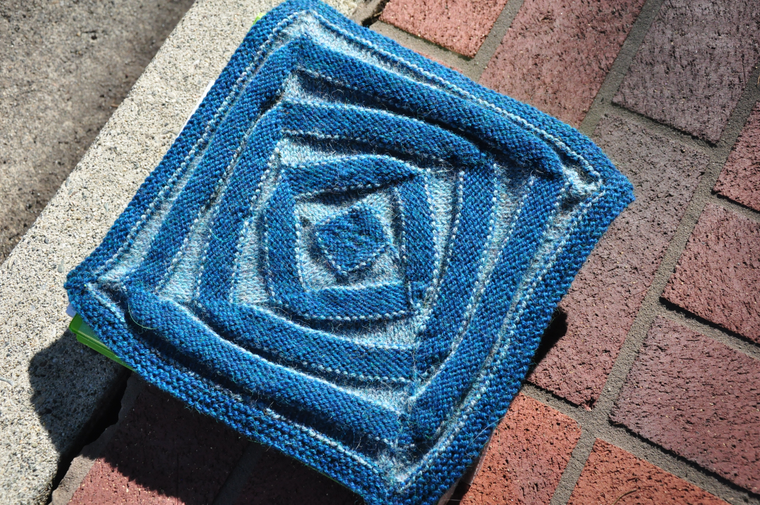 This is a square from the book The Great American Afghan, and it is done using the Ultra Alpaca by Borocco. The first thing that struck me about the square was the color! As you all know, blue is my favorite color. I also love the yarn choice and was surprised that I had not seen these colors before. Upon closer examination however, I realized that I had seen them! I just had never seen them together like this. Also, by having the lighter blue done in reverse stocking stitch (the purl side showing) and the darker blue in stocking stitch (the knit side showing), natural “peaks” and “valleys” are formed. This helps to give the lighter blue a “pop” that you wouldn’t get by just alternating in stocking stitch. Hence a way you can use BOTH color and texture together and not have a busy piece. There’s also another great side effect to this. The work is reversible, and has an equally stunning effect on the reverse. Check this out …