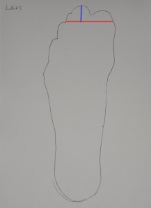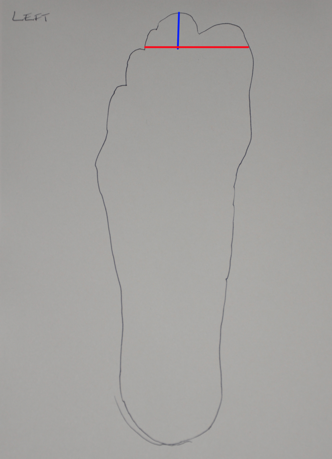 So now that you’re comfortable with the cast-on, let’s actually do it. Oh, but wait … how many stitches? I’m glad you asked. Take the swatch you made yesterday – you did make one, right? Now using that,find out your number of stitches per inch. Now measure your foot or paper trace of the foot you’re making the socks for. If you look at the diagram below of the foot I’m making the socks for, I’ll be measuring the red line. Depending on the foot you’re pleasing with these socks, you might want to adjust that line up or down.