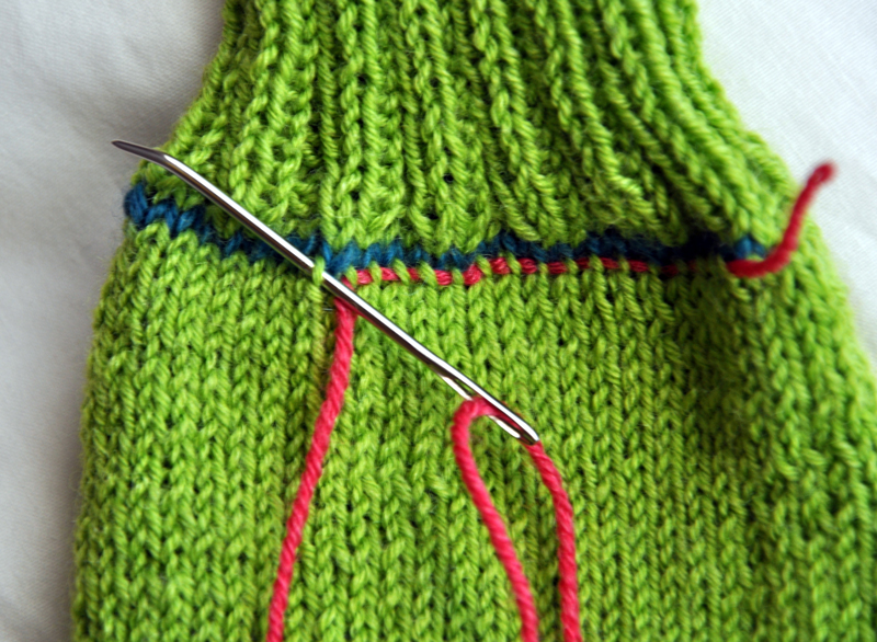 Follow along the row of contrast yarn above and below with a darning needle and slip the contrast yarn through each stitch.