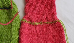 There you have it! Did you like the little trick at the end? Thought you would. Isn’t it amazing how the simplest things are usually the ones we discover last? Okay, so now you know how to cast off your cuffs, so go ahead and do that. After that, you’ll want to put in two lifelines above and below the row of stitches that are marking the place for our heels. Yes, they’re an afterthought, but we didn’t forget about them. Here’s what your lifelines should look like.