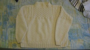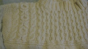So what has brought on this enlightenment you might ask? Well, remember the Guernsey that I made a couple of weeks back? Again, if you didn’t see the post, click this link (Guernsey). I was quite happy with it and liked the way it came out – I was even a little disappointed that I hadn’t made it in a size for myself. Well, I decided to wash it yesterday. I used a wool by Nashua called Creative Focus Superwash. According to the label it is washable in the machine with cold water. I did this but was very surprised as to how much it relaxed during the process. The Honeycomb cables had opened up considerably (usually it’s the opposite effect – small gaps where you didn’t tighten the cable enough actually close up) and the purl stitches were straight horizontal lines in the sweater. and the X-O cable had a vertical line going down the middle. The care instructions for the yarn say to lay flat to dry but I wanted to try and possibly tighten this back up a bit. Well it worked – a little.