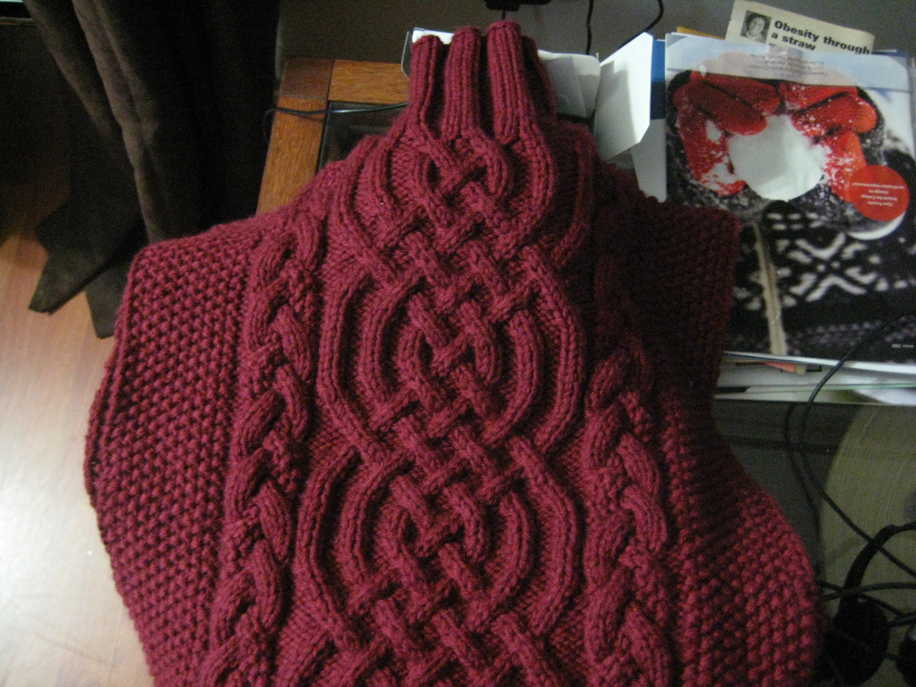 Wow, it’s been a crazy couple of days for me and the lack of a post in that time reflects it. I’m sorry for not having one in my drafts for those of you that check here daily. I will try and make sure that doesn’t happen again. In the meantime, I’ve been actually work very hard those days. I was on the set of V on Wednesday and Smallville yesterday. Both days turned out to be about 14 hours and I found when I got home I ended up just flopping into bed to get some much needed sleep. The bright side is I did get some work done on the knitting front. A couple of years ago I designed and knit a sweater using an expanded Saxon braid pattern. The sleeves on the sweater were too wide and I haven’t gotten around to finishing the original project. It was completed initially, then I actually removed the sleeves, frogged the body down to the armpit, and re-knit it with a smaller neck. I frogged both sleeves and have almost re-knit one … yeah, it’s in my UFO pile right now. I’ll dig it up and put a picture in this post.