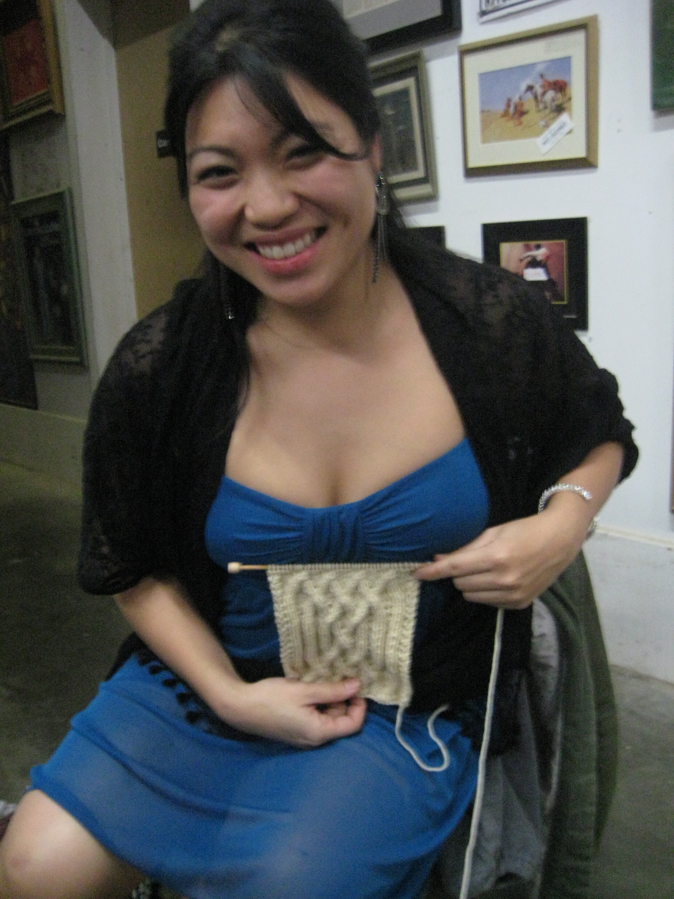 So what I did, and the point of this post, is redid the pattern during the lull on set. If I had originally wrote out everything I would have had to do this – yes Anne, I know (but I am learning). So in the end the re-design turned out to be a little trickier than I thought it would be and I had to do it a couple of times. So while doing that, I realized that there really is more than 1 way to skin a cat (does anyone know where that saying comes from?). You see, the regular Saxon braid is a 26 stitch repeat pattern that is completed over 16 rows. I have however seen it done a number of ways (3) because a Saxon braid is simply a braid done with 6 strands of yarn.This is part of the reason I was having difficulty with the 8 strand braid. If there are a number of ways to do a braid with 6 strands, there must be the same if not more to do it with 8. Anyway, at the end of the day I had recreated the 8 strand braid and am now working on decreasing the number of rows in the repeat to see if I prefer the look tighter. Here’s the lovely Louisa holding the swatch I came up with …