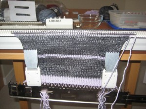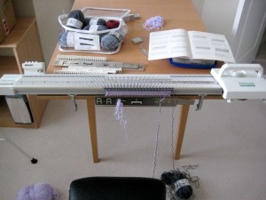 I love hand knitting. I love the way it feels when the yarn flows over your fingers, the texture of the fibers, and the thought of creating something with a twist of your fingers. Every now and then however, I feel the need to pull out one of my machines and just whip something up. The KAL boxers that I am currently working on have given me a reason to do just that (thanks Chris)! You see, as much as I like putting my brain on hold from time to time, I get terribly bored knitting plain stocking stitch if the fiber is ordinary as well. The boxers in question are knit in stocking stitch with sock yarn! 6.5 stitches and 8.5 rows to the inch sock yarn! On 3mm needles! Am I complaining? Okay – sorry – no more of that. I like to think of myself as a pretty quick knitter, but after about 7 hours of knitting and only having half the front panel done, I thought I’d give these a try on my Passap Vario. That lead into doing a blog post about machine knitting. So here I am …