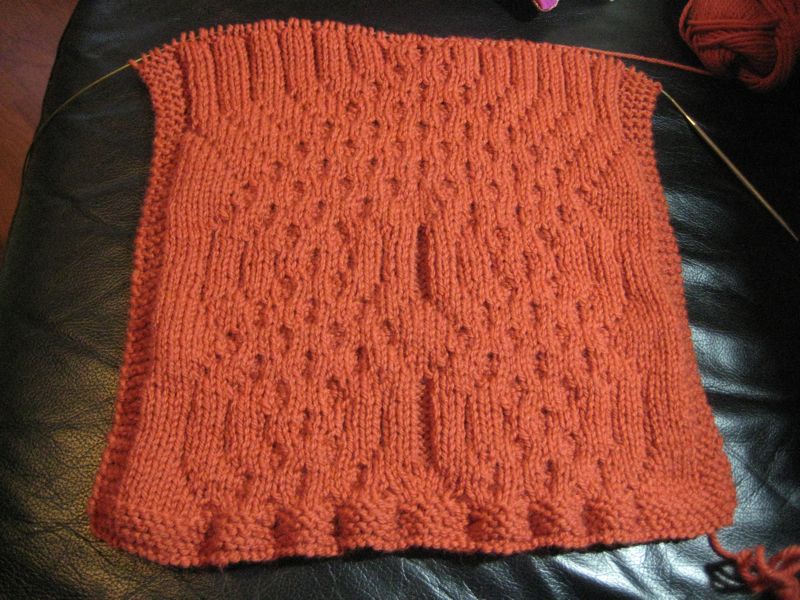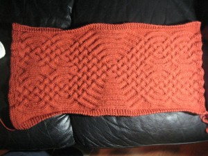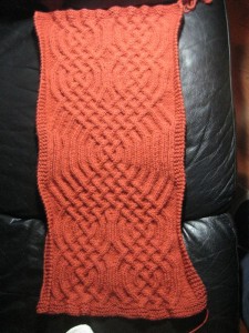 What I really like about this pattern is that the back of the fabric is almost as appealing as the front. Anyway, the purpose of this sample was to show at least one idea of the options available to someone that wanted to create something with these braids. While you could knit just one of them as a center panel in an Aran sweater, you are definitely not limited to that. You could create very interesting combinations and use them in a blanket, or to adorn just a sleeve on a plain sweater or whatever you want to come up with. Karen gave me a very interesting idea that I am going to look into as well. She suggested making the strands thicker so that the overall effect of a giant cable would be more pronounced. She was thinking of making a baby blanket and in her own words thought “wouldn’t it be great to be hugged by a giant cable”. Once you have the pattern, to do this it’s simply a matter of increasing the knit stitches as they are the ones that represent the “strands” in the braid. Just remember that it has to be an even number or you’ll have to make the necessary adjustments to the pattern yourself. I’ll have to try one like that soon.