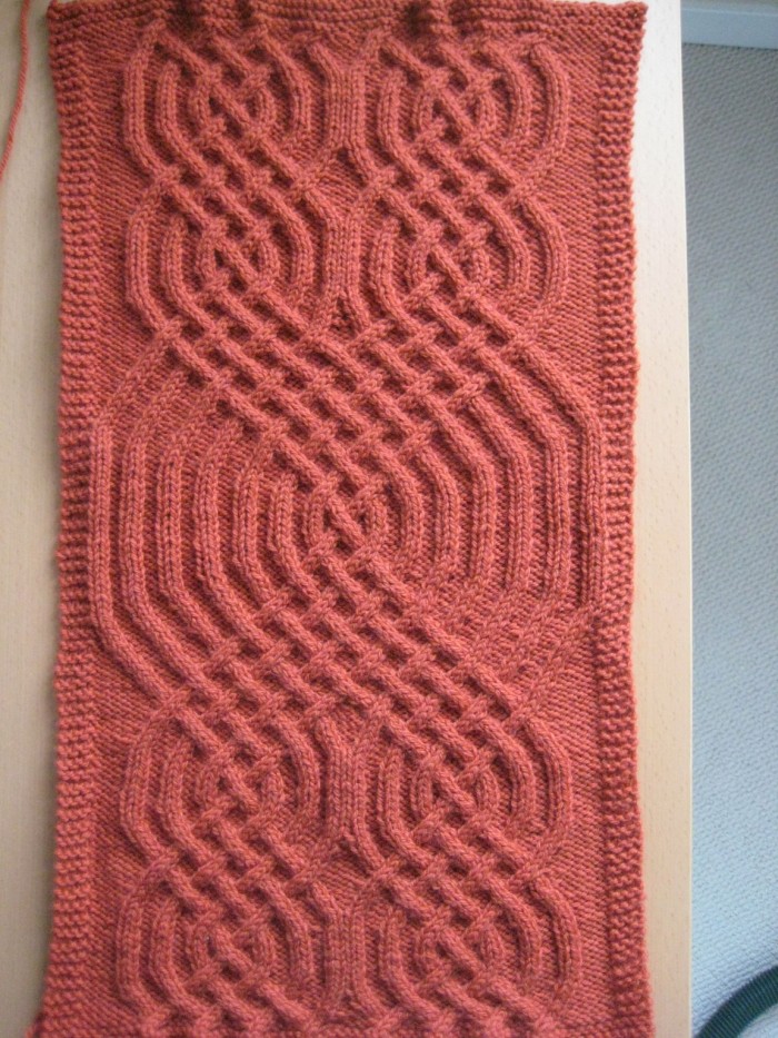 If you are able to draw a grid on the board this will help you but it is not necessary. You want to gently spread the piece to be blocked on the board to the desired size and shape. Start pinning the piece onto the board with the t-pins. You can use the head of the pins to hold down the yarn, keeping the piece in place. I like to work across the work so there isn’t too much stretching across the work. As I go, I pin and then slightly stretch the next few inches or so. This prevents overstretching in any one area. A general guideline I use is to have at least 1 pin every 3 inches, but if I have enough I’ll double that. The more pins you have the more even the stretch will be and the better your overall results. Once the piece has been pinned down, I take a water bottle with a sprayer nozzle on it and lightly dampen the fabric with the water. It should be damp to the touch but not soaked. I then take a dry white towel and place it over the piece. I leave it overnight to dry – longer if necessary. Remove the pins and your blocking is done. If i am using delicate fibers, I will test this with the swatch first and use a hand steamer if necessary. The important thing is to use the method you are comfortable with. Here is a picture of the sample from my last post once it has been blocked. right away you will notice that the blocking allows the work to lie flatter and shows the cable flare more prominently. This is another advantage of blocking – it shows mistakes that need to be tended to in the final design – in this case the cable flares. I’ll account for those in my final pattern, but I don’t mind them here as I wanted to knit the piece and show the pattern.